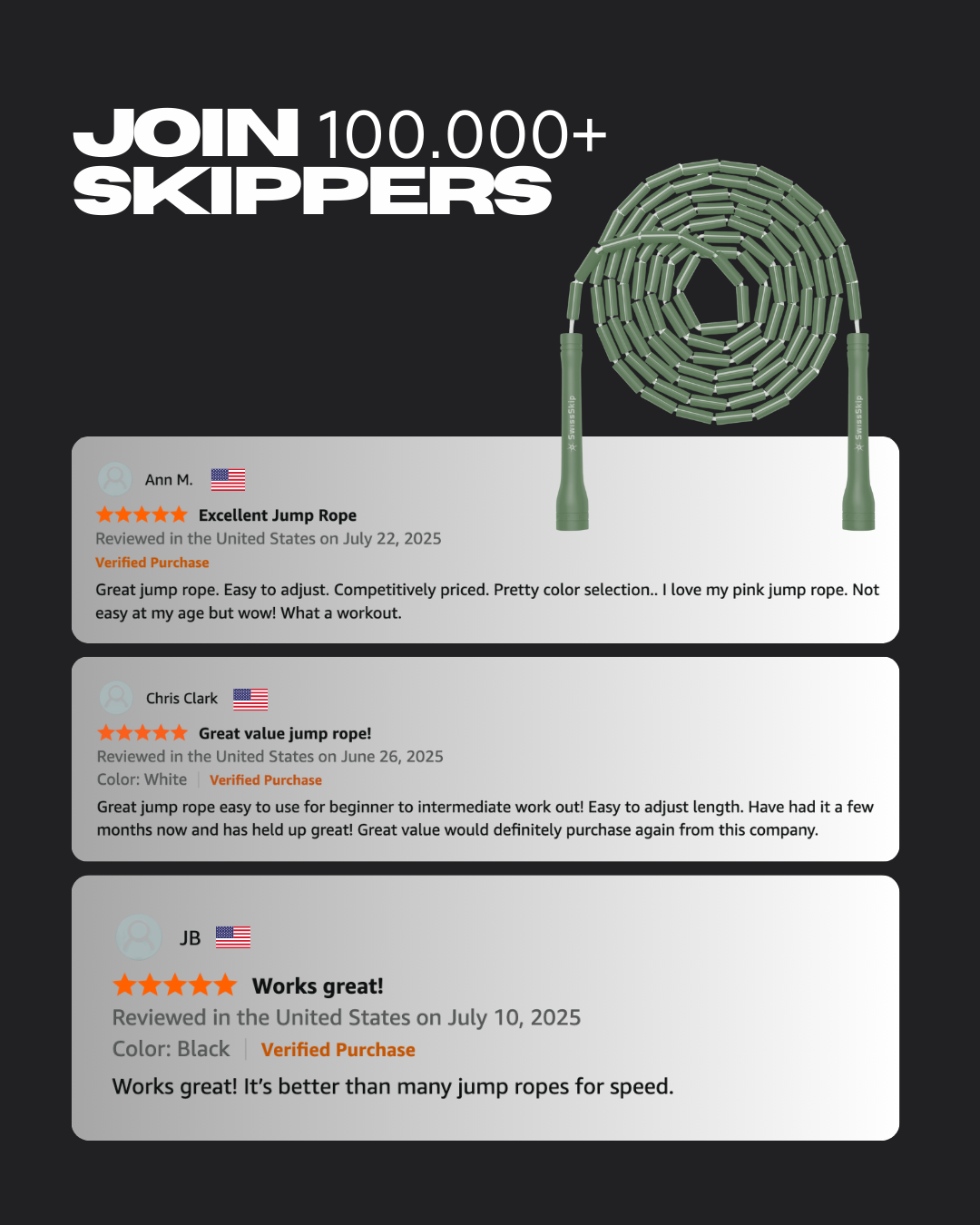 Most ropes tangle. They drag, snag, bounce unpredictably, and force you to quit after 10 jumps — which makes you disappointed in not reaching your goals. But the tangle-free beaded mechanism keeps every rotation smooth, so you stop tripping and can finally skip for 5 minutes straight.